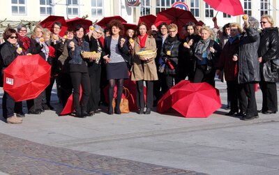 Mit Schirm, Charme und Zitrone. „Wir sind sauer“, lautet die Botschaft. Und: „So kann es nicht weitergehen!“ Denn das Lohngefälle zwischen Männern und Frauen ist nach wie vor enorm hoch – rund 22 Prozent weniger verdienen Frauen. In Arbeitszeit umgerechnet macht das volle 79 Tage: „79 Tage des Jahres, in denen Frauen praktisch umsonst arbeiten“, sagt Christel Riedel. Das heißt – den gleichen Lohn für gleichwertige Arbeit gerechnet – erst ab dem 20. März beginnt das Einkommensjahr für Frauen, der Equal Pay Day.