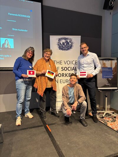 (Auf dem Bild von links nach rechts: Nadia Bisang (AvenirSocial), Gabriele Stark-Angermeier (DBSH), Julia Pollak (obds), Stefan Rudolf (younion (AT))