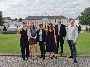 7 Vertreter*innen des Kampagnenteams von #dauerhaft.systemrelevant und dem DBSH e.V. sind einer Einladung von Bundespräsident Frank-Walter Steinmeier ins Schloss Bellevue gefolgt. Sie haben dort stellvertretend seinen Dank für das ehrenamtliche Engagement im Berufsverband, im Kampagnenteam und in ihren Praxisstellen während der Pandemie entgegengenommen.