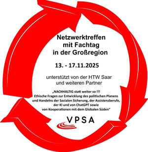 Gemeinsam mit der Hochschule für Technik und Wirtschaft Saar (htw saar), der Fakultät für Sozialwissenschaften und weiteren Partnern lädt der VPSA zum Fachtag 2025 ein. Am 13. und 14. November 2025 stehen Vorträge, Diskussionen und Austausch rund um das Thema Nachhaltigkeit im Mittelpunkt. Zusätzlich erwarten die Teilnehmenden vom 13. bis 17. November vielfältige Netzwerktreffen im Rahmen der Fort- und Weiterbildung. Der DBSH LV Saar ist mit einem Stand beim VPSA-Fachtag an der htw saar vertreten – kommt vorbei, informiert euch und nutzt die Gelegenheit zum persönlichen Gespräch.