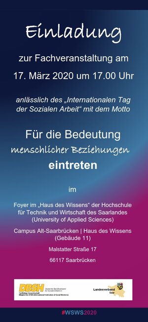 Der Landesverband Saar des "Deutschen Berufsverbandes für Sozialen Arbeit e.V." (DBSH) und die "Hochschule für Technik und Wirtschaft des Saarlandes" (htw) (University of Applied Sciences) - Fakultät für Sozialwissenschaften (School of Social Sciences), die Saarländische Armutskonferenz, der Paritätischer Wohlfahrtsverband Landesverband Rheinland-Pfalz/Saarland e.V. und die Arbeitskammer des Saarlandes, führen am "Internationalen Tag der Sozialen Arbeit" (ITSA) 2020 eine Veranstaltung in den Räumlichkeiten der htw des Saarlandes durch.