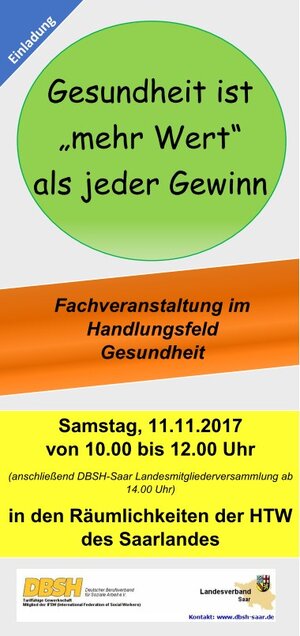 Am Samstag, den 11. November 2017, veranstaltet der DBSH Landesverband Saar eine Fachveranstaltung unter dem Motto "Gesundheit ist "mehr wert" als jeder Gewinn". In der Zeit von 10.00 bis 12.00 Uhr können alle Interessierte an dem öffentlichen Teil der Veranstaltung teilnehmen.