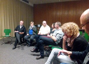 Am Abend traf sich die Gruppe mit Vertreter_innen des DBSH Landesverbandes Bayern sowie Beschäftigten im Handlungsfeld der Flüchtlingshilfe. Zunächst führte Rory Truell (Generalsekretär des IFSW global) in die Thematik ein. Am Beispiel einer Naturkatastrophe auf den Philippinen stellte er verschiedene Möglichkeiten und Handlungsansätze der Sozialen Arbeit vor. Nach dem Taifun Haiyan nahmen die Bewohner einer zerstörten Insel die Hilfsunterstützungsangebote selbst in die Hand. Die Infrastruktur entwickelte sich in Kürze wieder. Eine andere Insel wiederum wurde von Dritten und Hilfsorganisationen betreut und hat heute noch den Status, dass sie von diesen abhängig ist. Was zeigt uns dieses Bild?