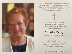 Die beiden hatten sich in der DBSH Senioren*Innenvertretung kennengelernt und sehr gut miteinander harmonisiert und zusammen gearbeitet. Als bekannt wurde, das Monika Petry verstorben ist, war es für Heidi Bauer-Felbel eine Selbstverständlichkeit, an der Beisetzung teilzunehmen. Dafür wurde ihr vom DBSH LV Saar und der Familie mit höchstem Respekt gezollt. Heidi Bauer-Felbel hatte eine lange Anreise aus Rostock auf sich genommen, um Monika Petry auf ihren letzten Weg zu begleiten.
