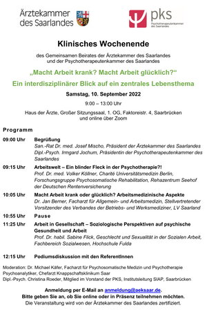 Interdisziplinären Veranstaltung der Ärztekammer und der Psychotherapeutenkammer des Saarlandes am Samstag, den 10.09.2022 mit dem Titel „Macht Arbeit krank? Macht Arbeit glücklich?“.