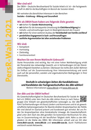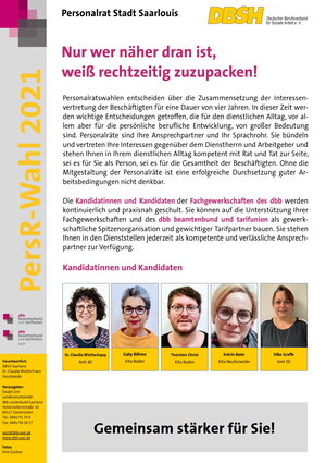 Am 17. Mai 2021 wird der Personalrat der Kreisstadt Saarlouis neu gewählt. Unter dem Motto "Nur wer näher dran ist, weiß rechtzeitig zuzupacken" kandidiert für die Gruppe der Arbeitnehmer in diesem Jahr Dr. Claudia Wiotte-Franz, Gaby Böhme, Thorsten Christ, Katrin Baier und Silke Graffe auf der Liste DBSH/dbb.