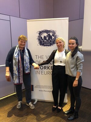 Die Delegierten des DBSH (Gabriele Stark-Angermeier und Julia Wilke mit der Präsidentin des IFSW Europe Ana Radulescu) auf der IFSW Konferenz Europe in Wien 2019.