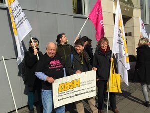 Passend zur "Begrüßung" der Arbeitgeber hatten sich Mitglieder des DBSH NRW vorm Tagungshaus in Münster zu einer Kundgebung eingefunden. Den beiden Landesvorsitzenden Waltraud Himmelmann und Stephan Leidinger war es gelungen im DBSH Landesverband NRW entsprechend Kollegen_innen zu mobilisieren. Gemeinsam mit Kollegen_innen des Schwesterverbandes der KOMBA zeigten diese vor Ort Flagge.