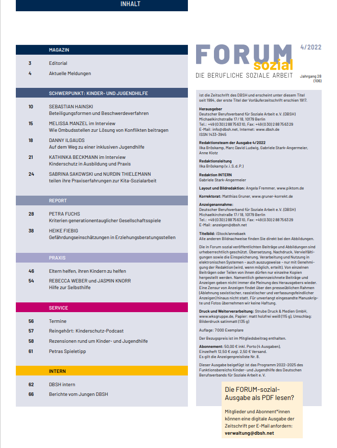 Hier können Sie über ein einfaches Online-Formular Publikationen, Materialien sowie Einzelhefte der Zeitschrift "FORUM sozial" bestellen. Zusätzlich zum Warenwert werden die Versandkosten durch den*die Käufer*in getragen.