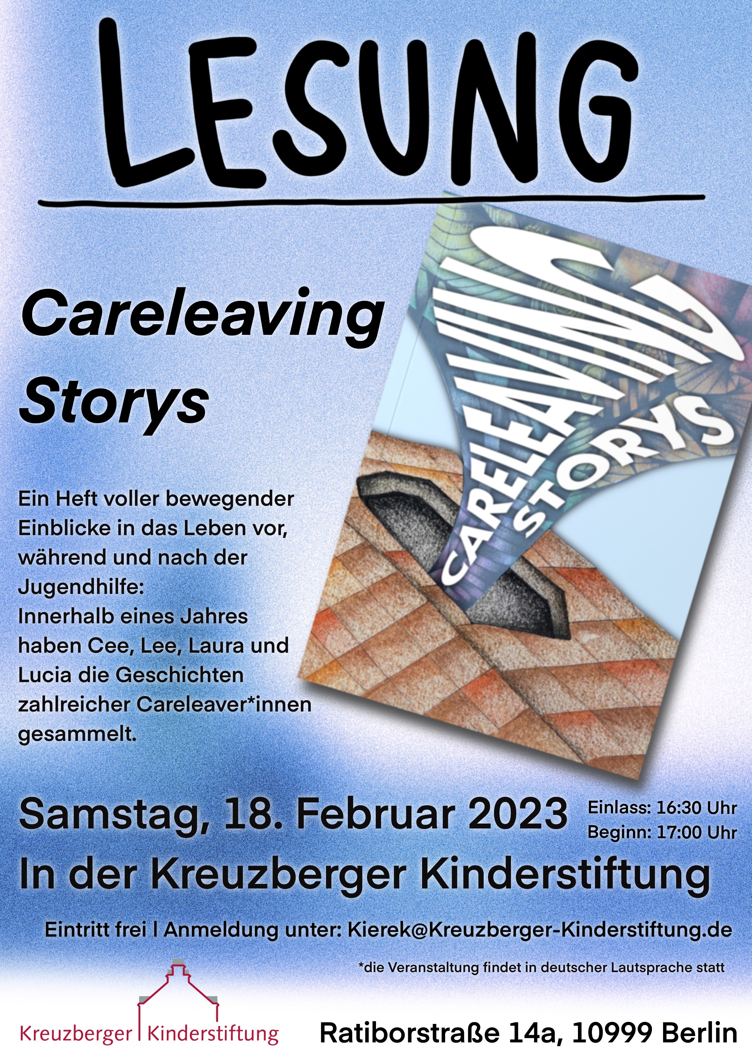 Careleaver Weltweit ermöglicht seit 2019 jungen Menschen, die in der stationären Jugendhilfe aufgewachsen sind, im Ausland wertvolle Erfahrungen zu sammeln. Mehr als 50 einzigartige, bereichernde und Biografie-einschneidende Auslandserfahrungen wurden bereits Careleavern aus dem ganzen Bundesgebiet ermöglicht. Darüber gibt es einen Austausch mit weiteren Projekten von und mit Careleavern – beispielsweise ist Carleaver Verbundspartner von Brückensteine. Aus dieser Initiative wurde die Gruppe Careleaving Storys eingeladen, die am 18. Februar ihre vor kurzem erschienene Kurzgeschichtensammlung vorstellen und live daraus vorlesen wird.