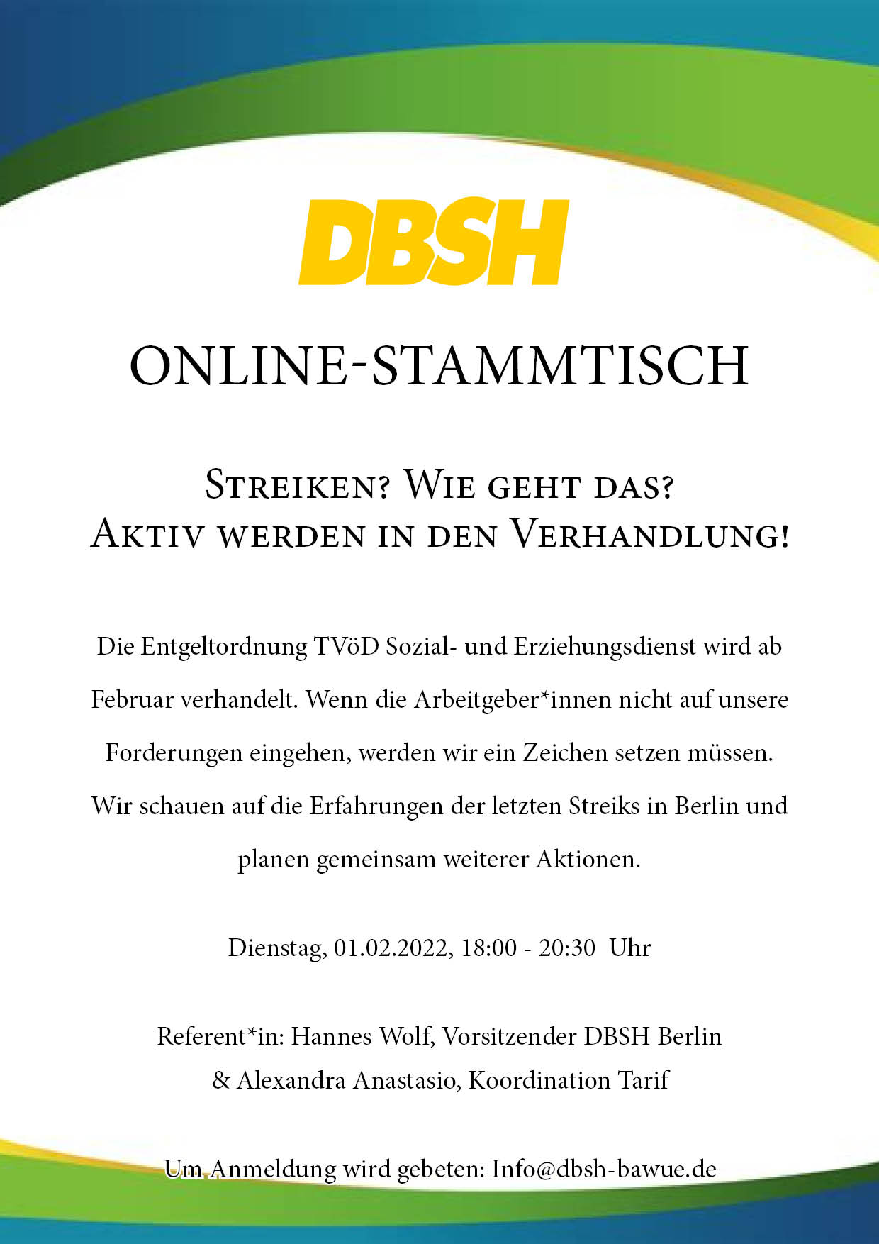 Die Entgeltordnund TVöD SuE wird ab Februar verhandelt. Deshalb bietet der Stammtisch dieses Mal Infos und Austausch zum Thema Aktionsplanung. Referent:innen in dieser Runde sind Hannes Wolf, Vorsitzender DBSH Berlin und Alexandra Anastasio, DBSH Koordination Tarif.