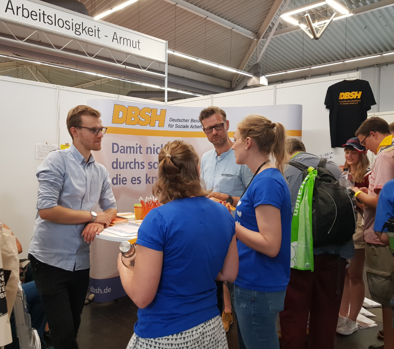 Unser Stand ist auf dem Markt der Möglichkeiten in Halle 7, Stand L09 angesiedelt. DBSH-Kolleginnen und Kollegen aus NRW und von der Bundesebene werden den DBSH in diesen Tagen für ein großes, vielfältiges, bunt gemischtes Publikum präsentieren. Der Markt der Möglichkeiten und die Messe im Markt finden in den Dortmunder Westfalenhallen und auf den Außenflächen statt. Für Besucher sind die Hallen täglich von 10.30 Uhr – 18.30 Uhr geöffnet. Insgesamt werden beim Kirchentag rund 2000 Veranstaltungen angeboten. Themen wie Migration, Digitalisierung, soziale Teilhabe und Europa sind außerordentlich aktuell. Sie haben einen direkten Bezug zu unserem Berufsverband und unserer Tätigkeit im sozialen Bereich.